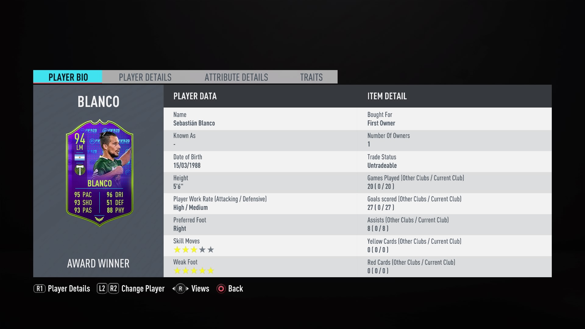 If you covered up this card and simply showed any FUT Manger the statistics with Award Winner Blanco I think you would get some interesting responses. Just a simple comparison between Blanco and some of the OP cards you face match after match results in some shockingly similar results. Of course, the statistics mean nothing if the card does not perform in-game… if you follow me on Twitter @IVIaeNine (changed Twitter to match my gamer tag) you will know he did perform and aided a return to an Elite finish this weekend… and it all started with 27 goals and 8 assists in 20 matches during this review… I think it is safe to say that Blanco does offer that in-game performance. In fact, everything about this card was made for FIFA 20 … from the 99 ACCELERATION & 99 PACE… to the 5’6 (168 cm) frame with 99 AGILITY & 98 BALANCE… and into the 92 FINISHING with a 5 STAR WEAK FOOT… he has it all.